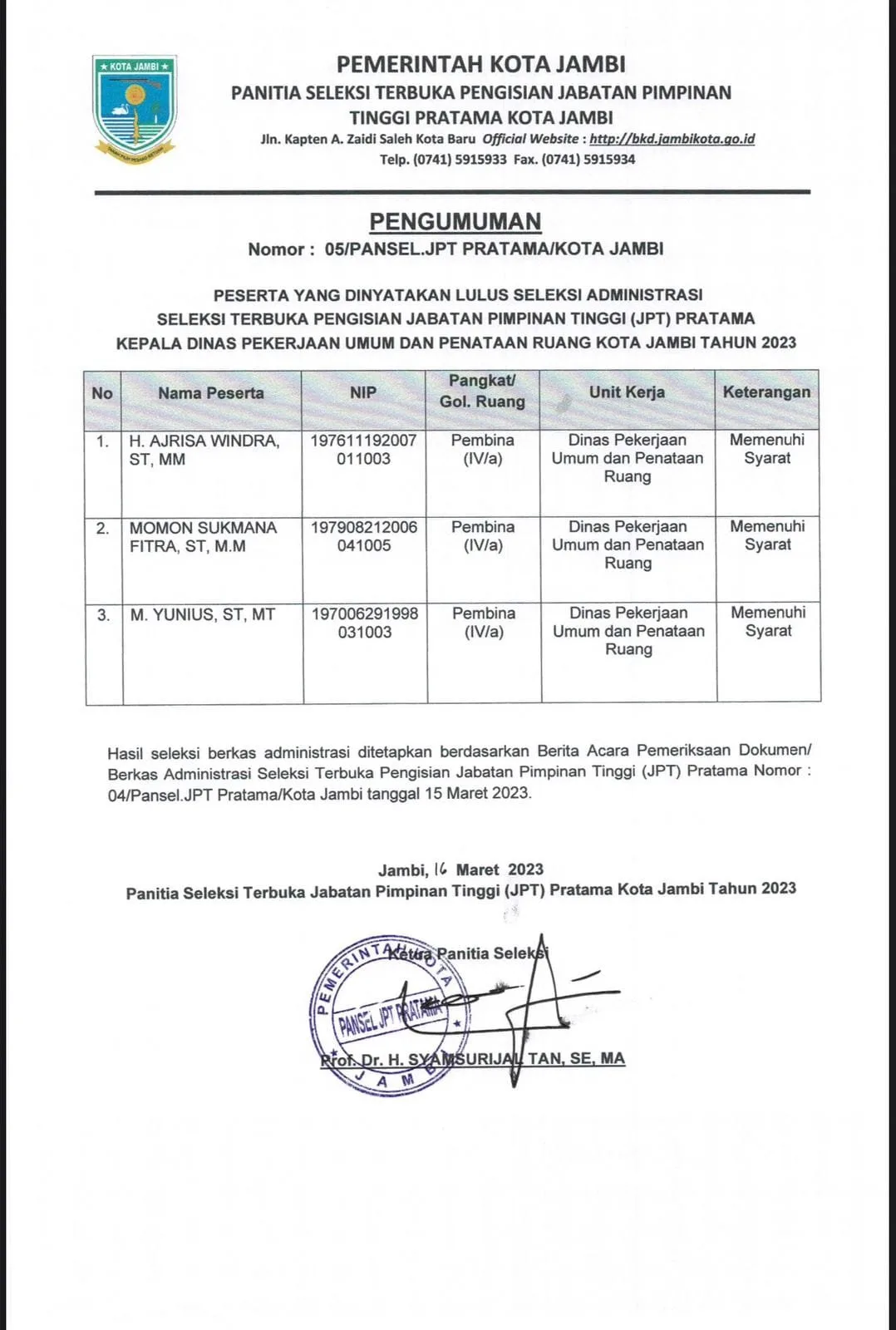 Berdasarkan penelusuran awak media, dalam pengumuman Pansel untuk posisi Kadis PUPR Kota Jambi tersebut terdapat 3 nama yang dinyatakan lolos seleksi administrasi.