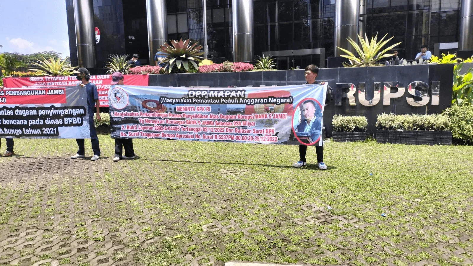 Jambi – Lembaga Pengawas Anggaran Negara DPP (LSM Mappan) kembali menggelar aksi demo di depan gedung kantor Komisi Pemberantasan Korupsi (KPK RI) terkait kasus dugaan korupsi di Bank 9 Jambi yang ditaksir Rp 235 miliar pada Kamis 16 Maret 2023.