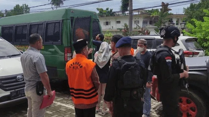 Dengan menggunakan, baju kemeja coklat bergaris putih, dilengkapi kopiah hitam serta rompi tahanan M Juber dan terdakwa lainnya digiring masuk mobil tahanan dengan tangan terborgol.