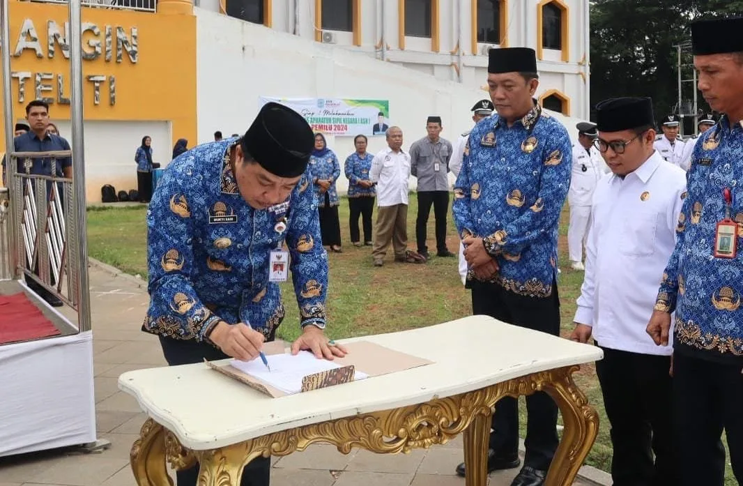 Merangin – Ribuan Aparatur Sipil Negara (ASN) di jajaran Pemkab Merangin berikrar ‘ASN Pilih Netral’, pada pemilihan umum 2024. Ikrar netralitas ASN tersebut dipimpin langsung oleh Pj Bupati Merangin, H. Mukti pada apel kedisiplinan pada Rabu, 17 Januari 2024.
