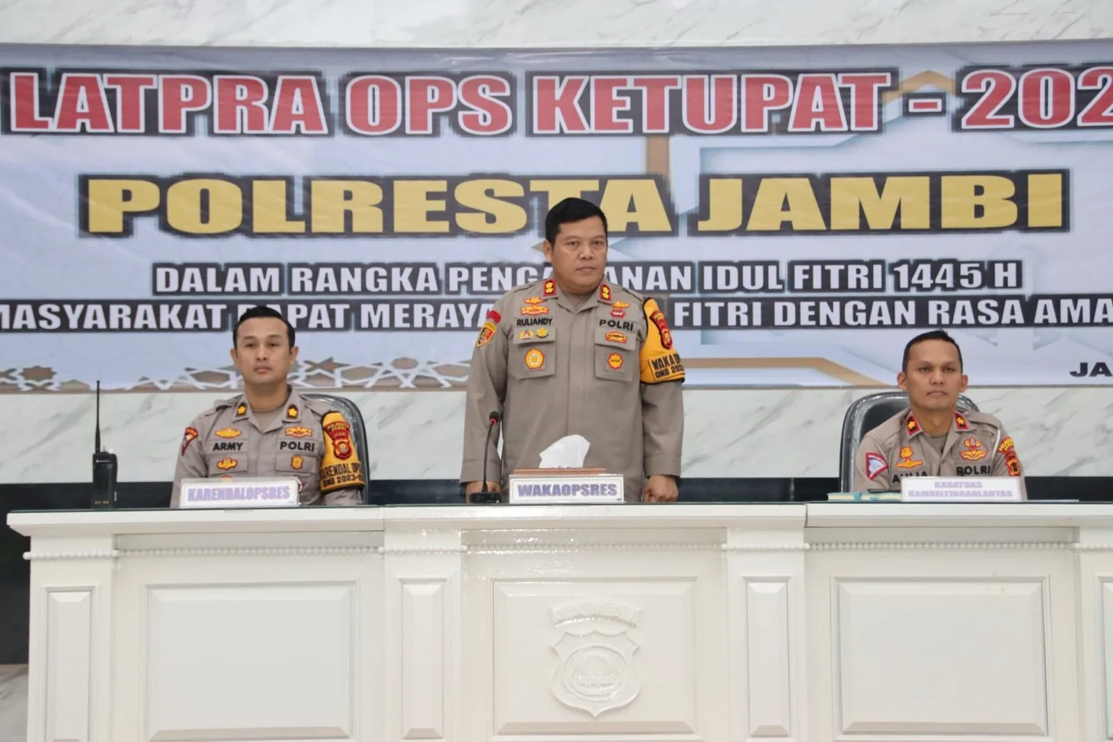 Kapolresta Jambi Kombes Pol Eko Wahyudi, SIK, MH dalam sambutannya yang dibacakan oleh Waka Polresta AKBP Ruliandi Yunianto, SIK menyampaikan Operasi Kepolisian Terpusat Ketupat 2024 digelar dalam rangka mewujudkan Sitkamtibmas dan Kamseltibcar lantas yang kondusif serta menjamin keamanan masyarakat dalam menjalankan Ibadah Puasa dan merayakan Idul Fitri 1445 H Tahun 2024.
