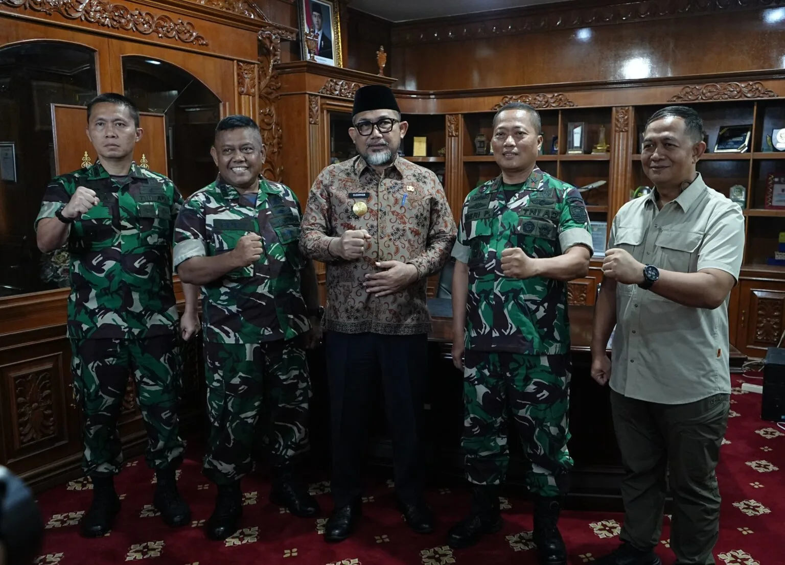 Jambi – Penjabat Sementara (Pjs) Gubernur Jambi Dr. H. Sudirman, SH., MH dengan didampingi Kepala Dinas Kominfo Provinsi Jambi Drs. Ariansyah, ME menyambut pejabat baru Komandan Korem 042/Gapu, Brigjen TNI Heri Purwanto, S.E. M.Sc. Penyambutan dan silaturahmi yang berlangsung di Ruang Kerja Sekretaris Daerah Kantor Gubernur Jambi pada Jum’at, 22 November 2024 ini Danren 042/Gapu turut didampingi Kasrem 042/Gapu Kolonel Inf. Eddy Basuki, Kasi Intel Kasrem Kolonel Inf. Imasfy, S.E., dan Kasi Ops Kasrem Letkol Inf. Wisyudha Utama.