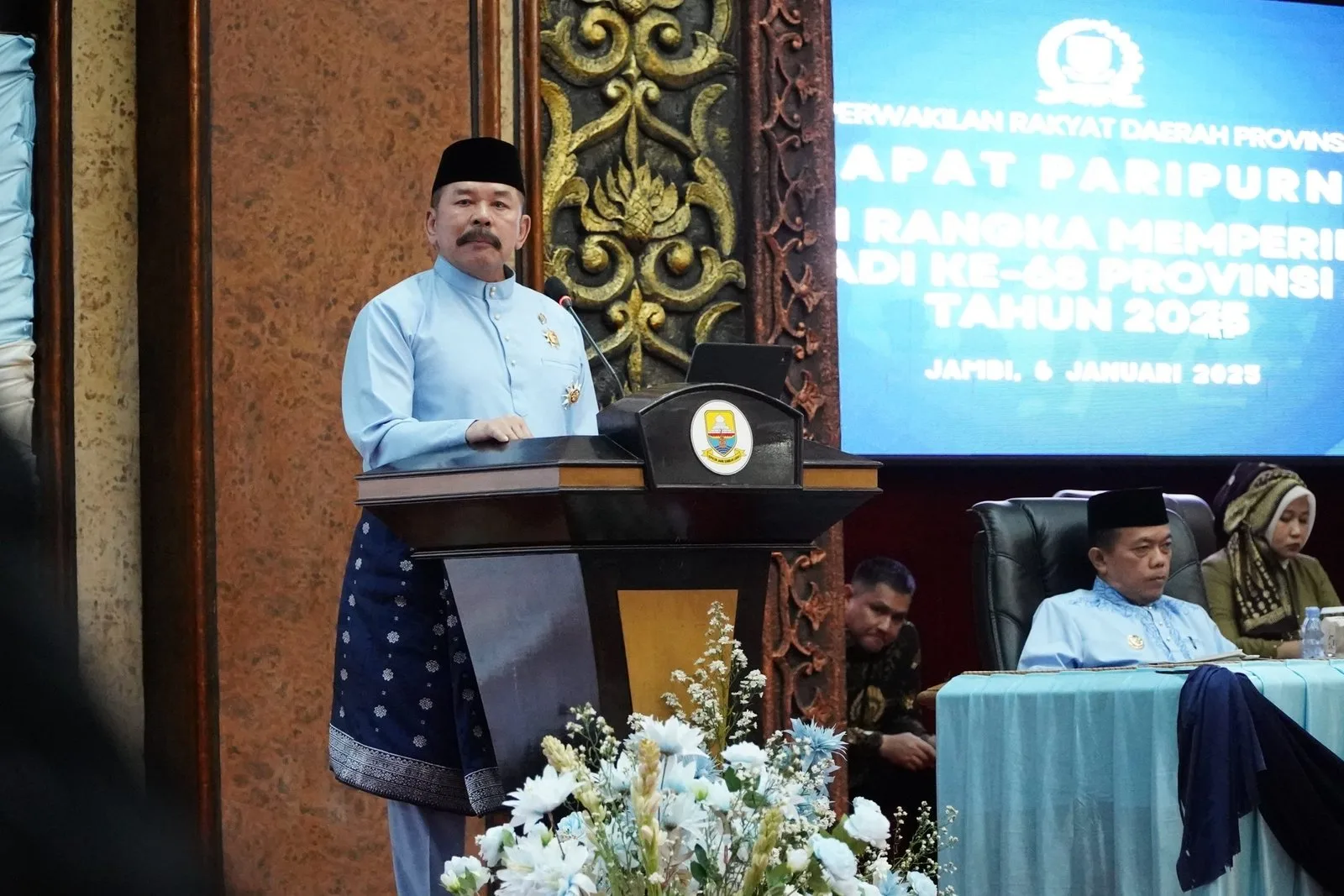 Jambi – Peringatan HUT ke- 68 Tahun Provinsi Jambi berlangsung di gedung Rapat Paripurna Provinsi Jambi ,Senin (06/01/25) HUT Provinsi Jambi ke -68 Tahun tersebut dihadiri oleh Jaksa Agung Dr. ST Burhanuddin, SH. MH dan Menteri Desa dan Pembangunan Tertinggal (PDT) Yandri Susanto.