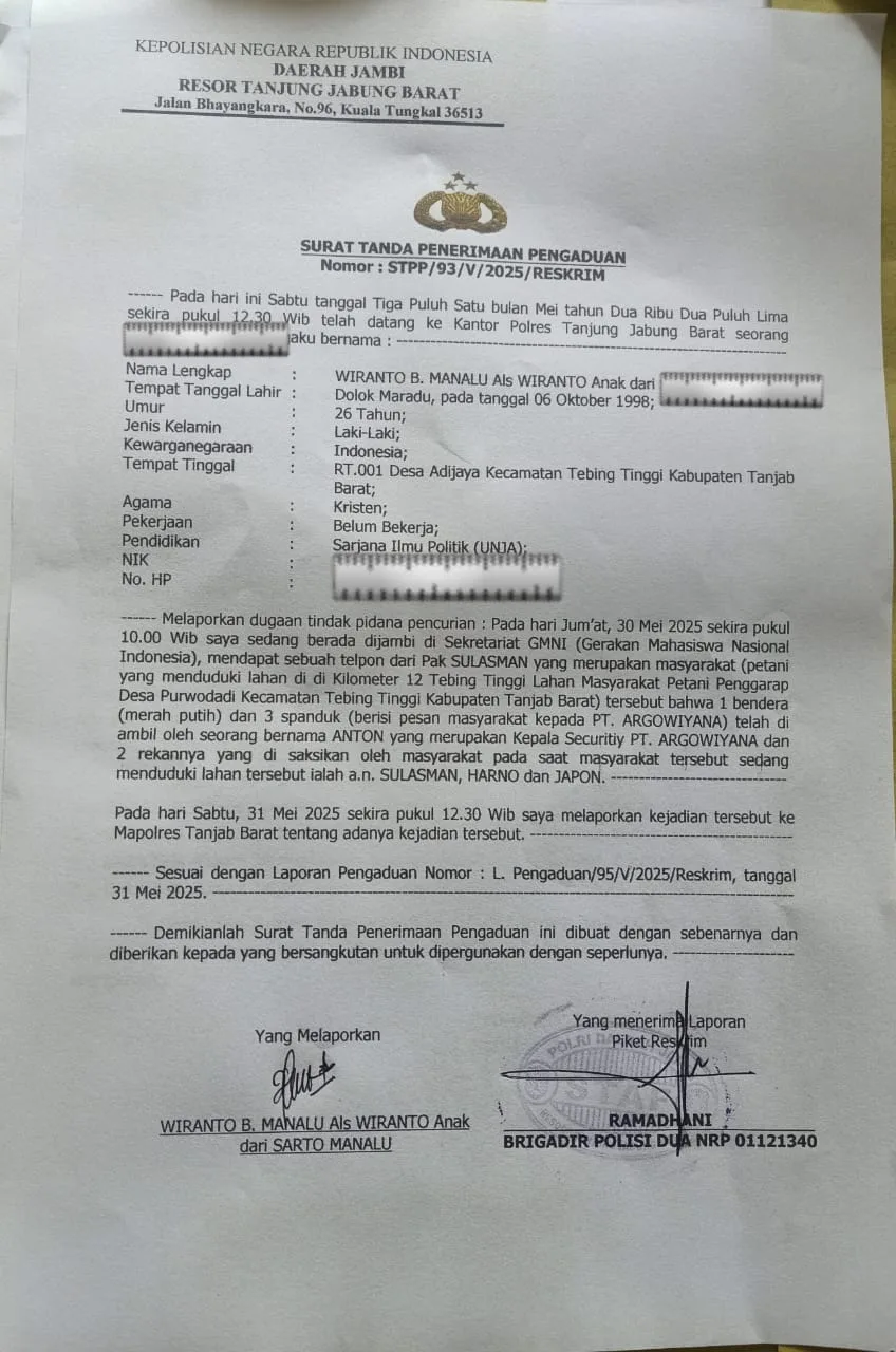 Tanjung Jabung Barat – Setelah melihat video yang direkam petani penggarap ketika tiga orang satpam pihak PT. Agrowiyana melakukan pengerusakan jembatan dan pencurian Bendera Merah – Putih Wiranto B Manalu selaku Pendamping Petani geram langsung menuju Polres Tanjung Jabung Barat pada hari sabtu, 31 Mei 2025.