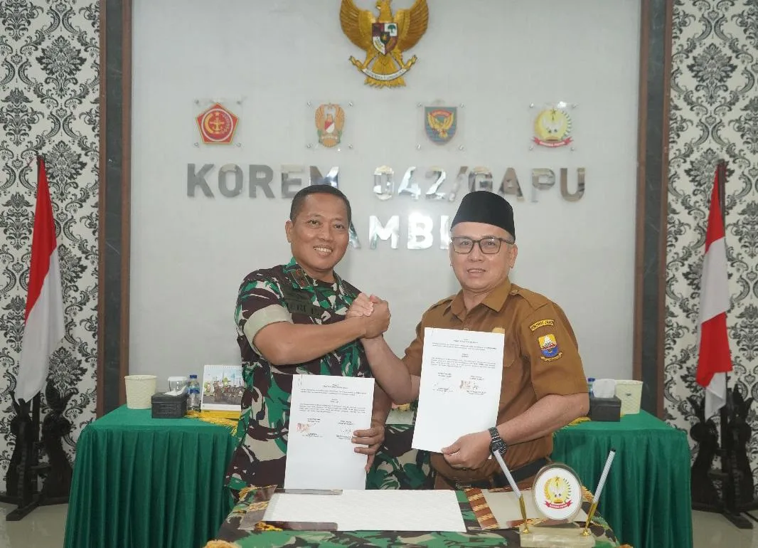 Jambi – Korem 042/Gapu bersama Dinas Tanaman Pangan, Hortikultura dan Peternakan (DTPHP) Provinsi Jambi resmi menandatangani Memorandum of Understanding(MoU) sebagai bentuk sinergi dalam mendukung percepatan program ketahanan pangan nasional. Acara berlangsung di Ruang Rapat Makorem 042/Gapu dan dipimpin langsung oleh Danrem 042/Gapu, Brigjen TNI Heri Purwanto, S.E., M.Sc., Senin 2 Mei 2025.