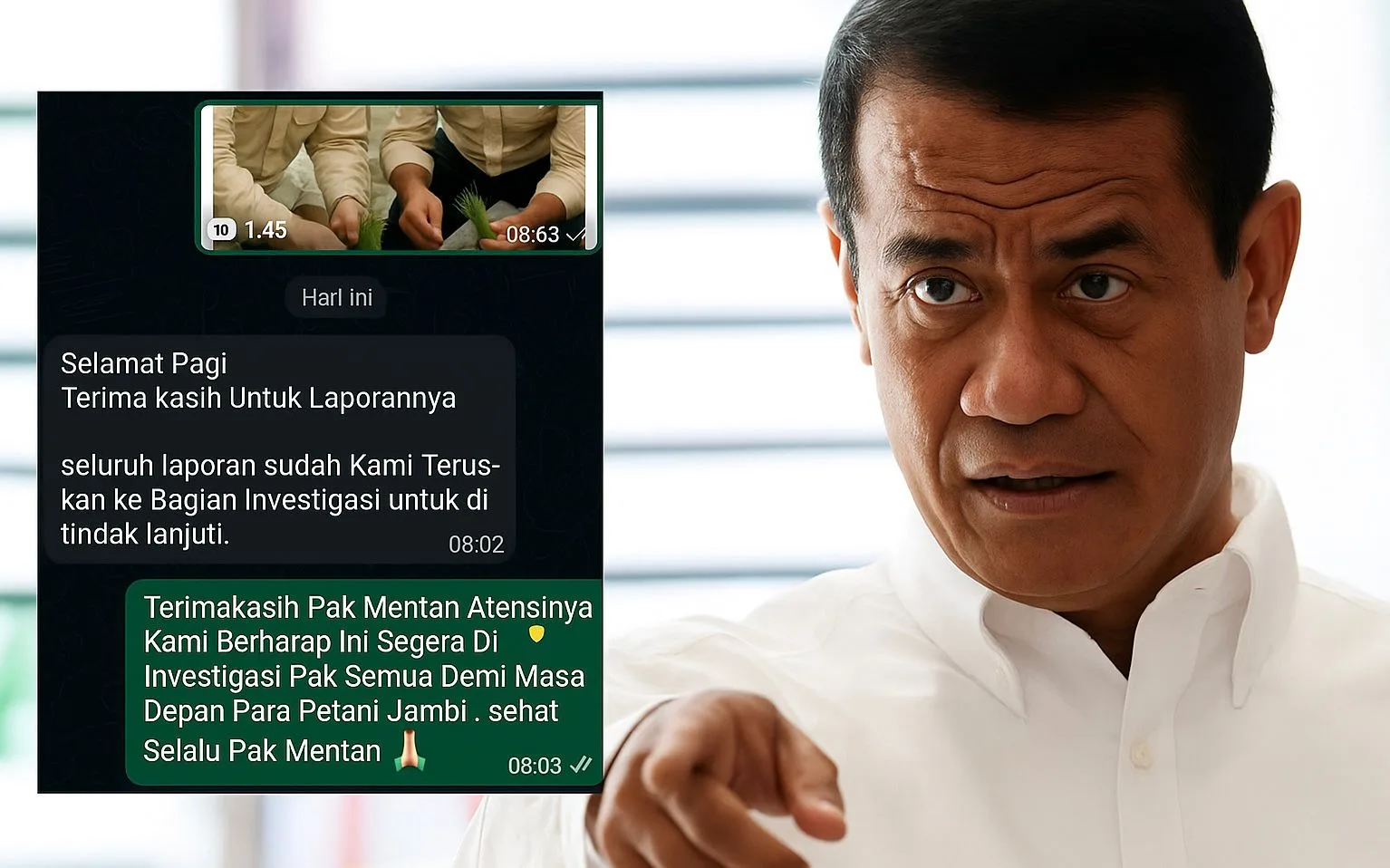 “Terima kasih Pak Mentan atas atensinya. Kami berharap ini segera diinvestigasi, Pak. Semua demi masa depan para petani Jambi. Sehat selalu Pak Mentan,” tulis tim dalam penutup komunikasi tersebut.