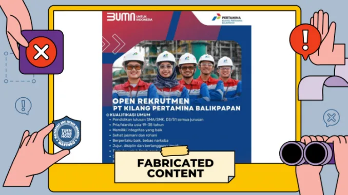 BALIKPAPAN — Beredar unggahan video di media sosial TikTok yang mengklaim adanya rekrutmen terbuka oleh PT Kilang Pertamina Balikpapan (KPB) melalui sebuah tautan pendaftaran. Unggahan tersebut langsung menarik perhatian publik, terutama para pencari kerja. Namun setelah ditelusuri lebih lanjut, informasi tersebut tidak benar dan tergolong hoaks.