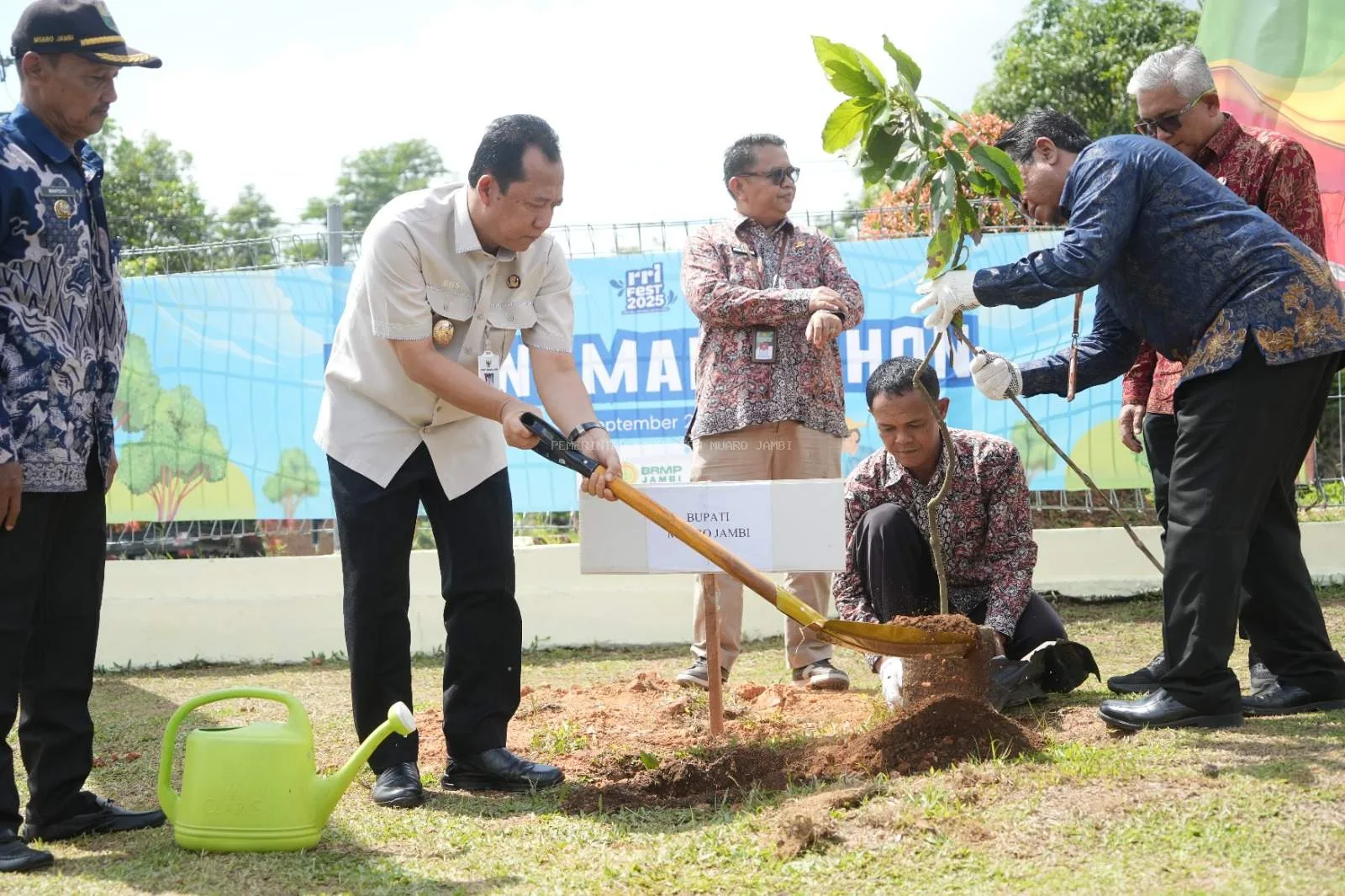 Muaro Jambi – Bupati Muaro Jambi, Dr. Bambang Bayu Suseno, S.P., M.M., M.Si., menghadiri kegiatan penanaman pohon dalam rangka memperingati Hari Ulang Tahun (HUT) RRI ke-80, Kamis (4/9/2025).