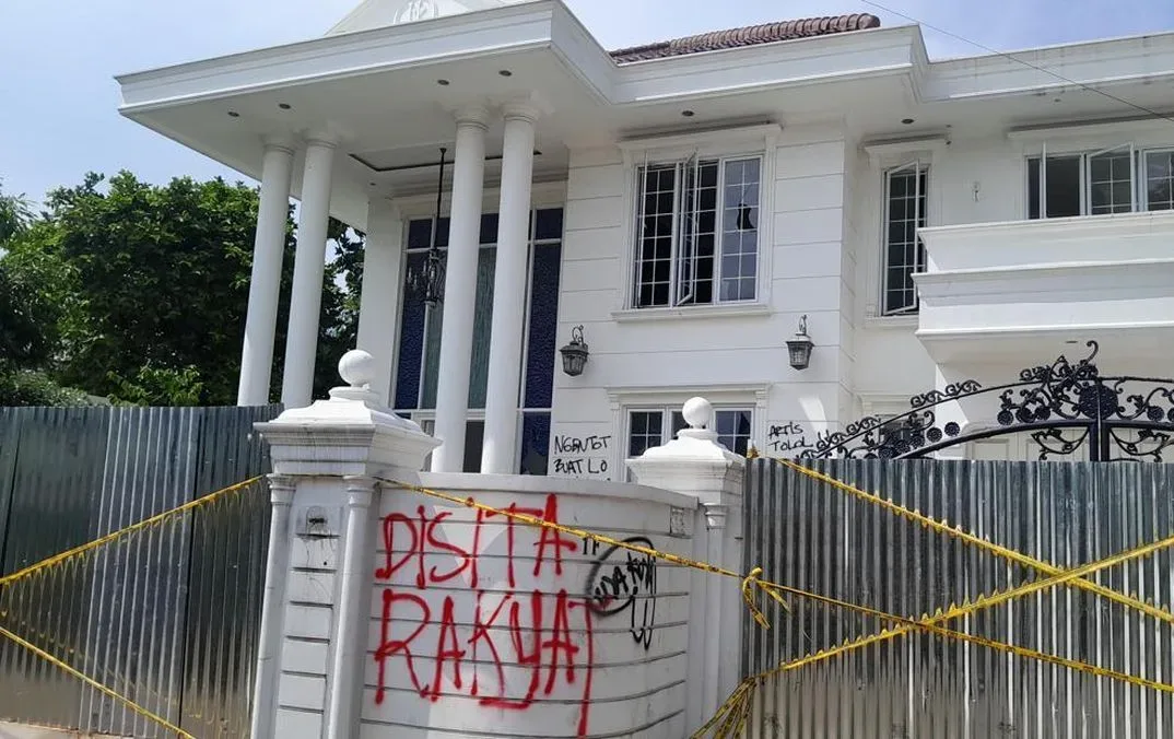 Pantauan pada Selasa (2/9), rumah bertingkat bercat putih itu sudah dipasangi garis polisi. Sejumlah bagian pagar yang rusak ditutup seng, sementara dinding rumah penuh coretan, mulai dari tulisan “Disita Rakyat” hingga “Uya Kuya Joget Pake Duit Rakyat”.