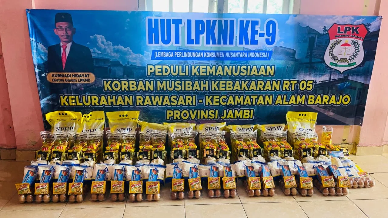 Jambi — Memperingati Hari Ulang Tahun (HUT) ke-9, Lembaga Perlindungan Konsumen Nusantara Indonesia (LPKNI) menyalurkan bantuan 19 paket sembako kepada warga RT 05, Kelurahan Rawasari, Kecamatan Alam Barajo, Kota Jambi, Sabtu (22/11/2025).