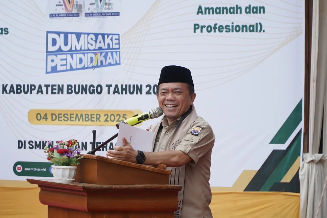 Bungo – Gubernur Jambi, Dr. H. Al Haris, S.Sos, M.H., menegaskan pentingnya persiapan generasi muda sebagai penerus bangsa yang merupakan aset negara. Ia menyoroti bahwa kualitas Sumber Daya Manusia (SDM) perlu ditingkatkan sejak dini, terutama melalui program pendidikan yang baik. Pernyataan ini disampaikannya saat menyerahkan bantuan dana Dumisake untuk pendidikan jenjang SMA, SMK, dan SLB tahun 2025, serta launching SMK Negeri Titian Teras Bungo dan pelantikan siswa-siswi di SMK Negeri Titian Teras Babeko, Kecamatan Babeko, Kabupaten Bungo, Kamis (4/12/2025).