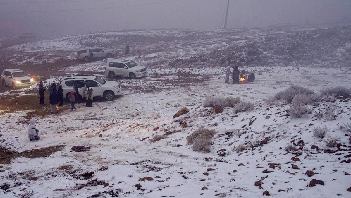 Pada Rabu (17/12), wilayah Jabal Al-Lawz dan Kota Tabuk mengalami hujan salju lebat, menambah deretan fenomena cuaca yang jarang terjadi di kawasan gurun ini.