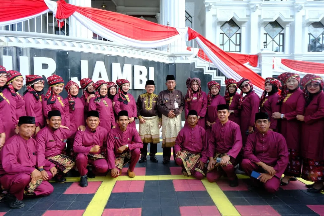 Jambi – Pemerintah Provinsi Jambi menggelar upacara peringatan Hari Ulang Tahun (HUT) ke-69 Provinsi Jambi di Lapangan Garuda, Kantor Gubernur Jambi, pada Selasa (6/1/2026). Upacara tersebut berlangsung khidmat dan tertib, dengan dihadiri oleh ratusan peserta dari berbagai kalangan. Semua peserta mengenakan pakaian adat khas Jambi, mencerminkan kekayaan budaya daerah. Peserta pria mengenakan Teluk Belango dengan peci hitam, sementara wanita mengenakan baju kurung dan tengkuluk.