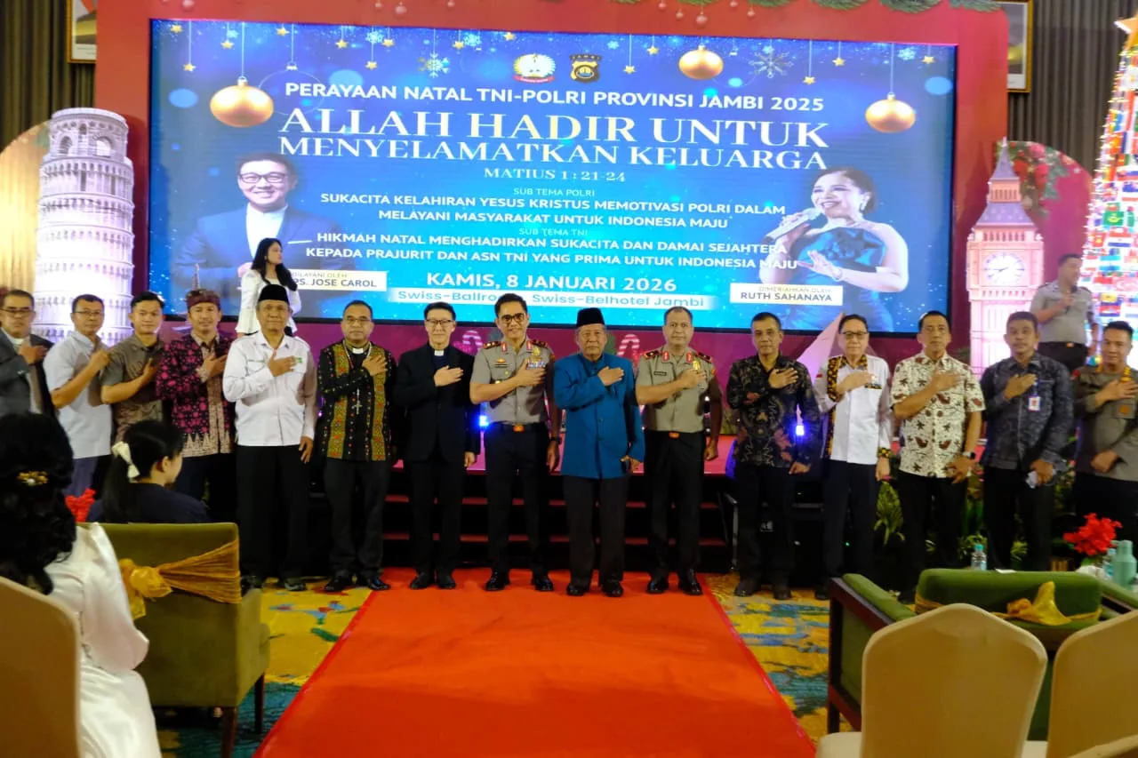 Jambi – Wakil Gubernur Jambi, Drs. H. Abdullah Sani, M. Pd.I, menekankan bahwa perayaan Natal mengajarkan makna kasih yang tulus, pengabdian tanpa pamrih, serta pengorbanan demi kebaikan bersama. Hal ini disampaikannya saat menghadiri Perayaan Natal bersama TNI/Polri yang digelar di Swiss-Bell Hotel, Kamis (8/1/2026) malam.