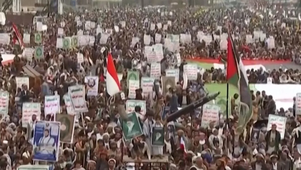 Ribuan pendukung kelompok Houthi berkumpul di pusat ibu kota Yaman, Sanaa, untuk menggelar aksi solidaritas bagi Iran dan Lebanon pada Jumat (6/3).