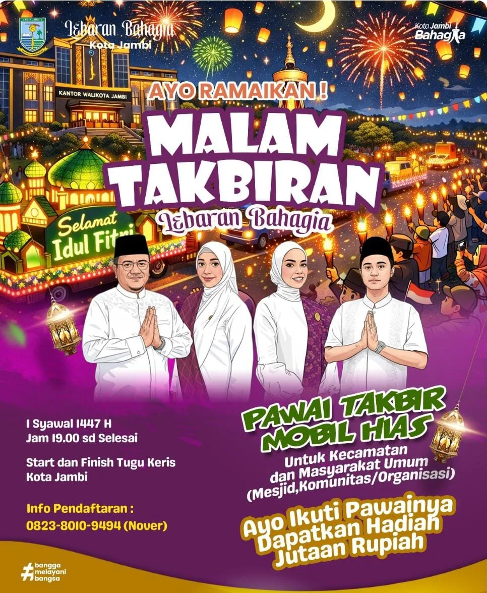 “Pawai Takbir Keliling Kendaraan Hias ini akan mengambil start dan finish di kawasan Tugu Keris Siginjai Kotabaru, dan akan dilepas langsung oleh Wali Kota Jambi bersama Wakil Wali Kota Jambi,” ujar Kadis Kominfo, Minggu (15/03/2026).